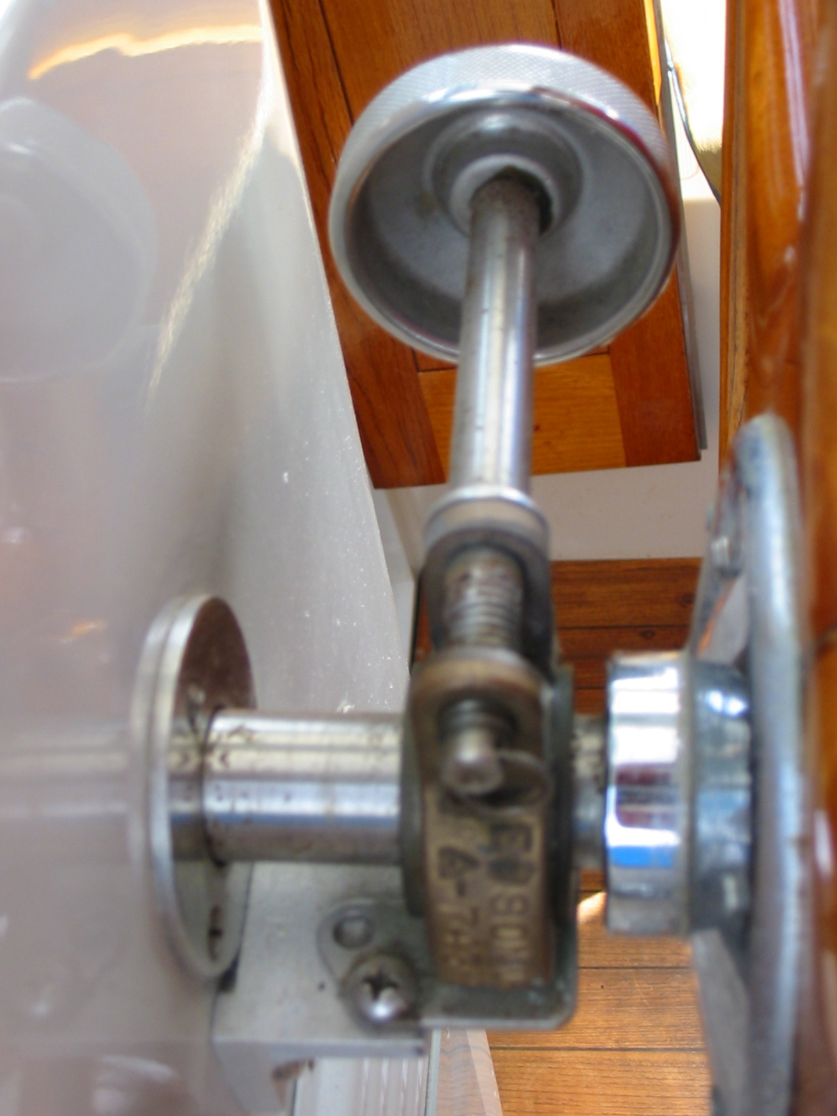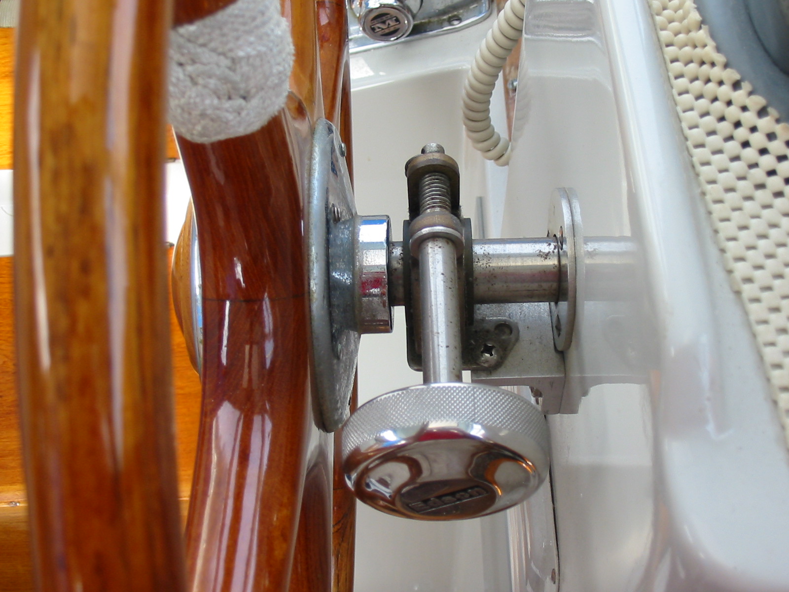 Securing the helm Welcome Back › Forums › Propulsion › Steering and Rudder › Securing the helm This topic has 2 replies, 2 voices, and was last updated 14 years, 2 months ago by Moderator. Viewing 3 posts - 1 through 3 (of 3 total) Author Posts December 29, 2011 at 21:00 #5641 ModeratorKeymaster Roger Haggar (Race Passage) recently sent me some photos of his wheel hub brake. He said: Quote: I took a Edson Pedestal steering brake (west marine 486183) and attached it to a fabricated base screwed into the bulkhead. A neat fitting. Thanks Roger for sharing this! January 12, 2012 at 22:00 #10931 Happy DolphinParticipant if your not in rush to fit one i will photo mine next time at boat. very simple been on for 20000 miles quick release locks wheel solid very simalar to one in photo but a lot simpler to fabricate and to fit January 15, 2012 at 00:48 #11001 ModeratorKeymaster I would love to see those photos, Roy, so please do post them once possible – thanks Marilyn Author Posts Viewing 3 posts - 1 through 3 (of 3 total) You must be logged in to reply to this topic. Log In Username: Password: Keep me signed in Enter something special: Log In